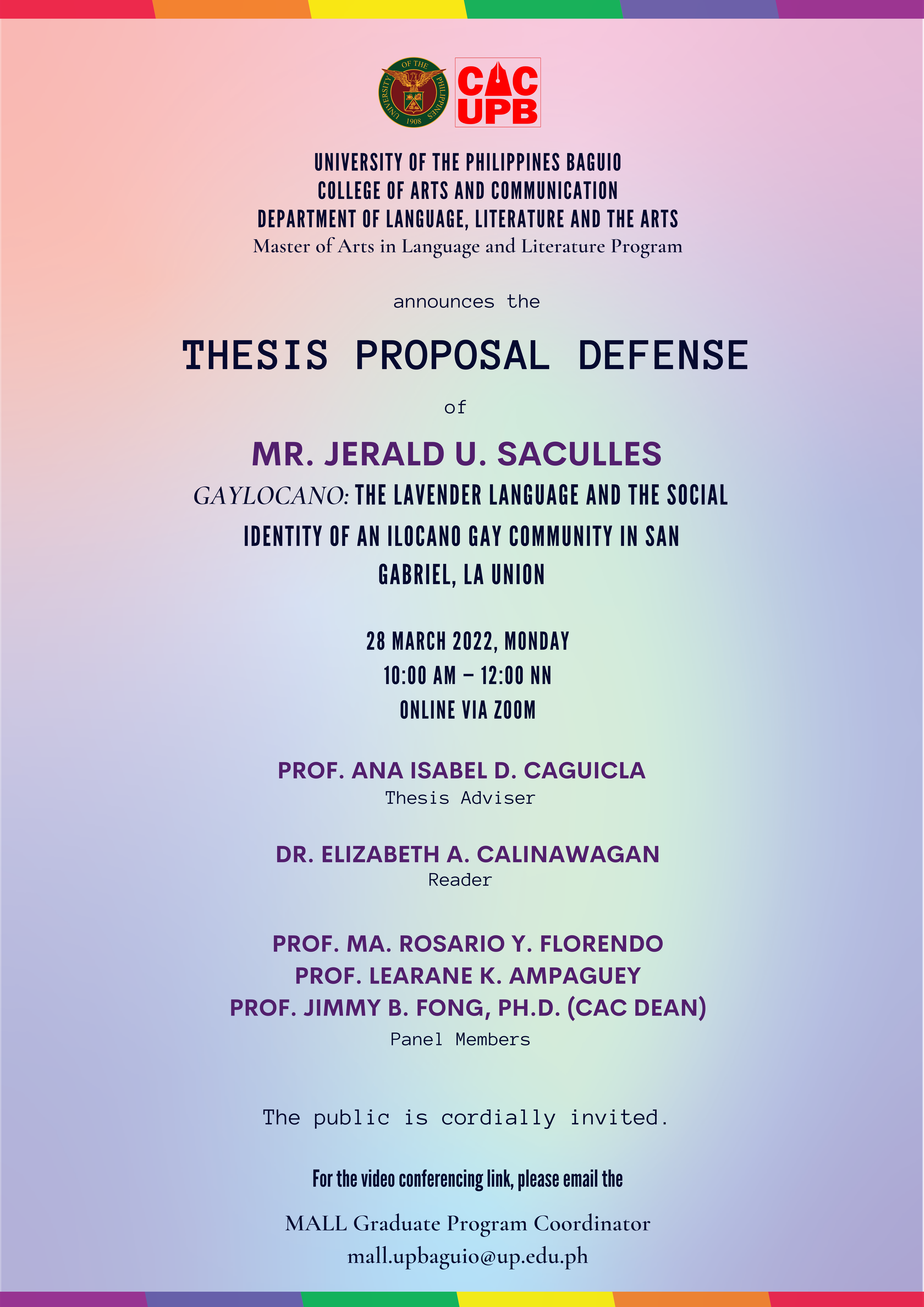 Thesis Proposal Defense: Jerald U. Saculles (MALL) - March 28,2022 (via Zoom)